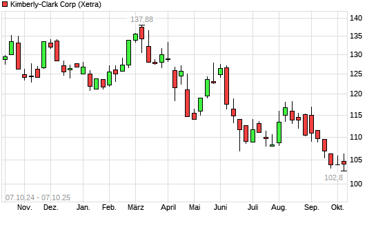 Mit dem Rücksetzer auf 104,00 EUR hat die Kimberly-Clark-Aktie (ISIN US4943681035) am 06.10.2025 ein neues 5-Jahres-Tief erreicht und damit den Kurs vom 26.09.2025 eingestellt.Die Kimberly-Clark-Aktie ...weiterlesen