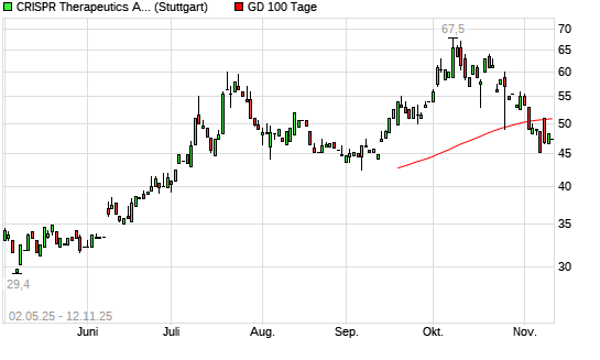 Mit dem Rücksetzer auf 48,20 EUR hat die CRISPR Therapeutics-Aktie am 11.11.2025 die 100-Tage-Linie nach unten gekreuzt.Die CRISPR Therapeutics-Aktie befindet sich seit dem 24.06.2025 im ...weiterlesen