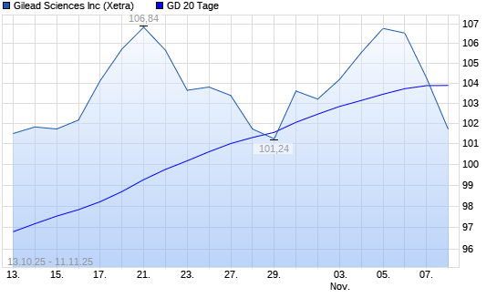 Mit dem Rücksetzer auf 102,14 EUR hat die Gilead Sciences-Aktie am 10.11.2025 die 20-Tage-Linie nach unten gekreuzt.Die Gilead Sciences-Aktie befindet sich seit dem 06.10.2025 im langfristigen ...weiterlesen