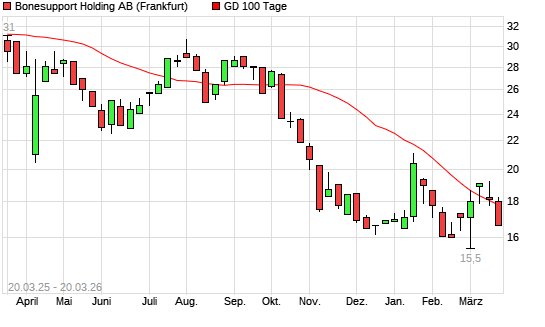 Mit dem Rücksetzer auf 16,80 EUR hat die Bonesupport Holding-Aktie am 19.03.2026 die 100-Tage-Linie nach unten gekreuzt.Die Bonesupport Holding-Aktie befindet sich seit dem ...weiterlesen