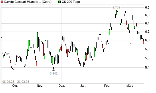 Mit dem Rücksetzer auf 5,84 EUR hat die Davide Campari-Milano-Aktie am 20.03.2026 die 200-Tage-Linie nach unten gekreuzt.Die Davide Campari-Milano-Aktie befand sich seit ...weiterlesen