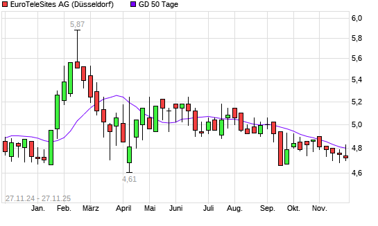Mit dem Rücksetzer auf 4,69 EUR hat die EuroTeleSites AG-Aktie am 26.11.2025 die 50-Tage-Linie nach unten gekreuzt.Die EuroTeleSites AG-Aktie befindet sich seit dem 08.09.2025 im langfristigen ...weiterlesen