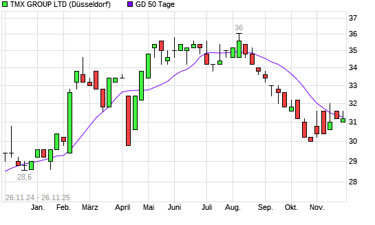 Mit dem Anstieg auf 31,60 EUR hat die TMX Group-Aktie am 25.11.2025 die 50-Tage-Linie nach oben gekreuzt.Die TMX Group-Aktie befindet sich seit dem 19.09.2025 im langfristigen Abwärtstrend und ...weiterlesen