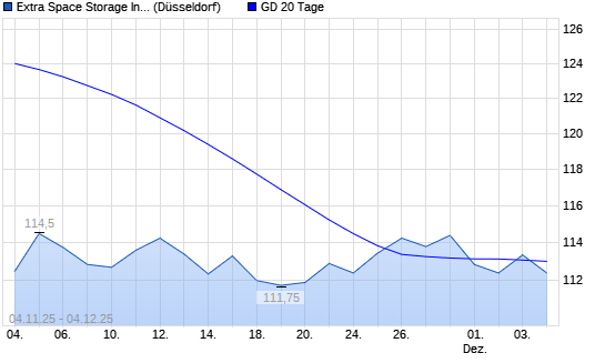 Mit dem Rücksetzer auf 112,80 EUR hat die Extra Space Storage-Aktie am 03.12.2025 die 20-Tage-Linie nach unten gekreuzt.Die Extra Space Storage-Aktie befindet sich seit dem 23.10.2025 im ...weiterlesen