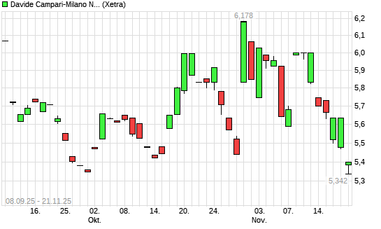Mit dem Rücksetzer auf 5,20 EUR hat die Davide Campari-Milano-Aktie (ISIN NL0015435975) am 20.11.2025 ein neues 6-Monats-Tief erreicht und damit den Kurs vom 30.09.2025 eingestellt.Die ...weiterlesen