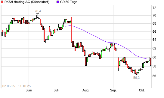 Mit dem Anstieg auf 60,00 EUR hat die DKSH Holding-Aktie am 10.10.2025 die 50-Tage-Linie nach oben gekreuzt.Der Abstand zur 200-Tage-Linie beträgt aktuell -10,59%.