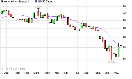Mit dem Anstieg auf 14,64 EUR hat die Kenvue-Aktie am 10.11.2025 die 50-Tage-Linie nach oben gekreuzt.Die Kenvue-Aktie befindet sich seit dem 29.05.2025 im langfristigen Abwärtstrend und hat ...weiterlesen