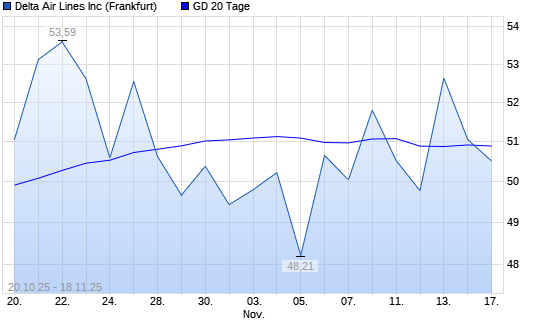 Mit dem Rücksetzer auf 50,52 EUR hat die Delta Air Lines-Aktie am 17.11.2025 die 20-Tage-Linie nach unten gekreuzt.Die Delta Air Lines-Aktie befindet sich seit dem 03.10.2025 im langfristigen ...weiterlesen