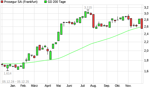 Mit dem Anstieg auf 2,62 EUR hat die Prosegur-Aktie am 04.12.2025 die 200-Tage-Linie nach oben gekreuzt.Die Prosegur-Aktie befand sich seit dem 03.12.2025 im langfristigen Abwärtstrend und hat ...weiterlesen
