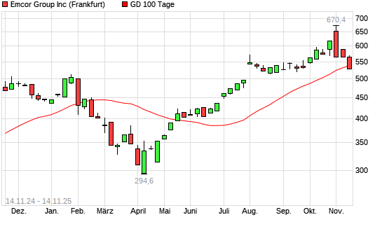 Mit dem Rücksetzer auf 531,60 EUR hat die EMCOR Group-Aktie am 13.11.2025 die 100-Tage-Linie nach unten gekreuzt.Die EMCOR Group-Aktie befindet sich seit dem 16.06.2025 im langfristigen ...weiterlesen