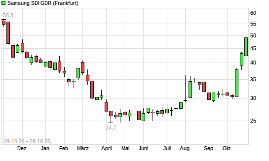 Mit dem Anstieg auf 46,50 EUR hat die Samsung SDI-Aktie (ISIN US7960542030) am 28.10.2025 ein neues 6-Monats-Hoch erreicht und damit den Kurs vom 27.10.2025 eingestellt.Die Samsung SDI-Aktie ...weiterlesen