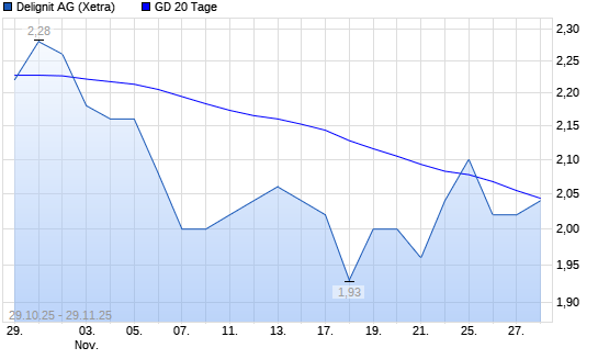 Mit dem Anstieg auf 2,00 EUR hat die Delignit-Aktie am 28.11.2025 die 20-Tage-Linie nach oben gekreuzt.Die Delignit-Aktie befindet sich seit dem 26.08.2025 im langfristigen Abwärtstrend und ...weiterlesen