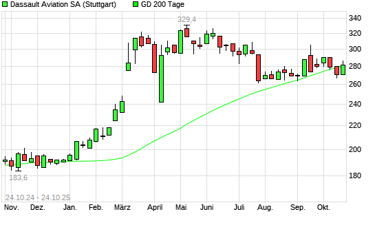 Mit dem Rücksetzer auf 281,00 EUR hat die Dassault Aviation-Aktie am 23.10.2025 die 200-Tage-Linie nach unten gekreuzt.Die Dassault Aviation-Aktie befand sich seit dem 22.10.2025 im langfristigen ...weiterlesen