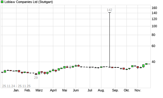 Mit dem Anstieg auf 38,00 EUR hat die Loblaw Companies-Aktie (ISIN CA5394811015) am 24.11.2025 ein neues All-Time-High erreicht und damit den Kurs vom 21.11.2025 eingestellt.Die Loblaw Companies-Aktie ...weiterlesen