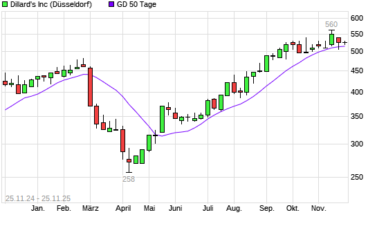 Mit dem Anstieg auf 530,00 EUR hat die Dillards A-Aktie am 24.11.2025 die 50-Tage-Linie nach oben gekreuzt.Die Dillards A-Aktie befindet sich seit dem 17.07.2025 im langfristigen Aufwärtstrend ...weiterlesen