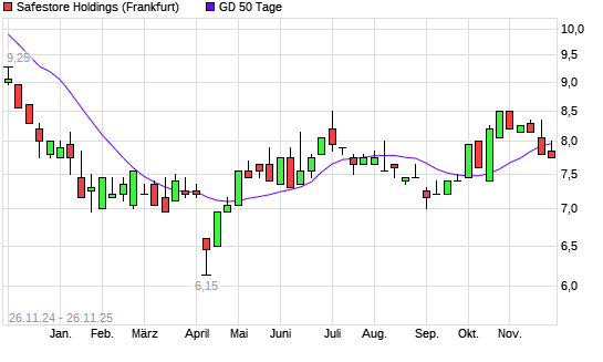 Mit dem Anstieg auf 8,00 EUR hat die Safestore Holdings-Aktie am 25.11.2025 die 50-Tage-Linie nach oben gekreuzt.Die Safestore Holdings-Aktie befindet sich seit dem 14.10.2025 im langfristigen ...weiterlesen