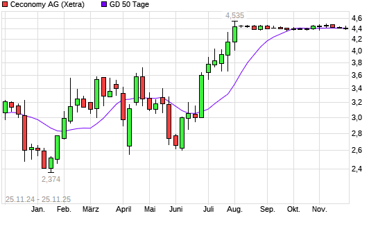 Mit dem Rücksetzer auf 4,38 EUR hat die Ceconomy St-Aktie am 24.11.2025 die 50-Tage-Linie nach unten gekreuzt.Die Ceconomy St-Aktie befindet sich seit dem 23.06.2025 im langfristigen Aufwärtstrend ...weiterlesen