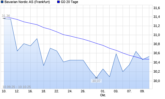 Mit dem Rücksetzer auf 30,46 EUR hat die Bavarian Nordic-Aktie am 09.10.2025 die 20-Tage-Linie nach unten gekreuzt.Die Bavarian Nordic-Aktie befindet sich seit dem 16.07.2025 im langfristigen ...weiterlesen