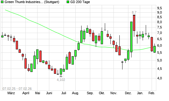 Mit dem Anstieg auf 5,95 EUR hat die Green Thumb Industries-Aktie am 06.02.2026 die 200-Tage-Linie nach oben gekreuzt.Die Green Thumb Industries-Aktie befand sich seit dem 05.02.2026 ...weiterlesen