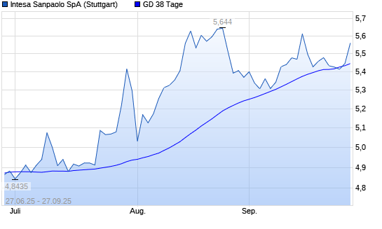 Mit dem Anstieg auf 5,56 EUR hat die Intesa Sanpaolo-Aktie am 26.09.2025 die 38-Tage-Linie nach oben gekreuzt.Die Intesa Sanpaolo-Aktie befindet sich seit dem 08.04.2025 im langfristigen Aufwärtstrend ...weiterlesen