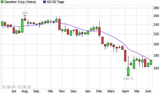 Mit dem Anstieg auf 171,82 EUR hat die Danaher-Aktie am 06.06.2025 die 50-Tage-Linie nach oben gekreuzt.Die Danaher-Aktie befindet sich seit dem 29.01.2025 im langfristigen Abwärtstrend und ...weiterlesen