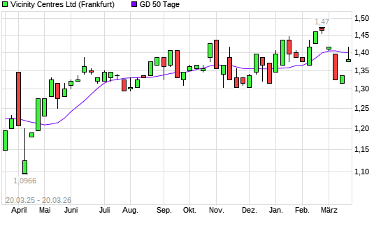 Mit dem Rücksetzer auf 1,40 EUR hat die VICINITY CENTRES-Aktie am 19.03.2026 die 50-Tage-Linie nach unten gekreuzt.Die VICINITY CENTRES-Aktie befindet sich seit dem 16.03.2026 ...weiterlesen