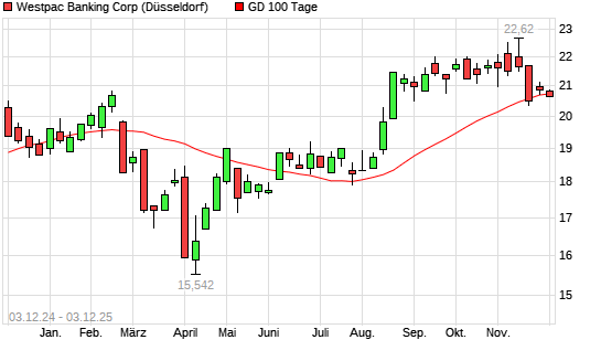 Mit dem Rücksetzer auf 20,84 EUR hat die Westpac Banking-Aktie am 02.12.2025 die 100-Tage-Linie nach unten gekreuzt.Die Westpac Banking-Aktie befindet sich seit dem 05.08.2025 im langfristigen ...weiterlesen