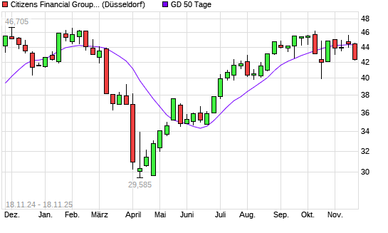 Mit dem Anstieg auf 44,38 EUR hat die Citizens Financial Group-Aktie am 17.11.2025 die 50-Tage-Linie nach oben gekreuzt.Die Citizens Financial Group-Aktie befindet sich seit dem 03.07.2025 im ...weiterlesen