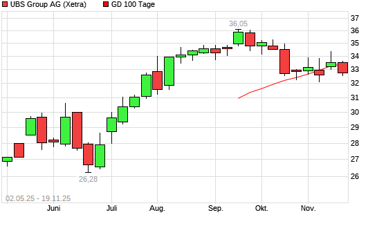 Mit dem Rücksetzer auf 32,64 EUR hat die UBS Group-Aktie am 18.11.2025 die 100-Tage-Linie nach unten gekreuzt.Die UBS Group-Aktie befindet sich seit dem 08.07.2025 im langfristigen Aufwärtstrend ...weiterlesen