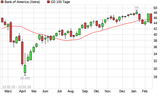 Mit dem Rücksetzer auf 45,50 EUR hat die Bank of America-Aktie am 11.02.2026 die 100-Tage-Linie nach unten gekreuzt.Die Bank of America-Aktie befindet sich seit dem 19.08.2025 ...weiterlesen