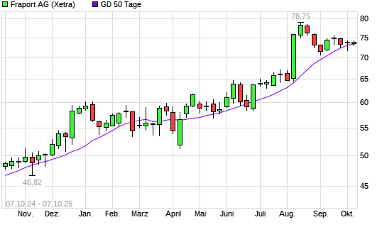 Mit dem Anstieg auf 74,05 EUR hat die Fraport-Aktie am 06.10.2025 die 50-Tage-Linie nach oben gekreuzt.Die Fraport-Aktie befindet sich seit dem 08.11.2024 im langfristigen Aufwärtstrend und ...weiterlesen
