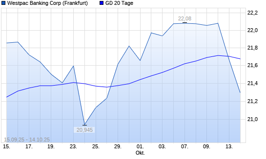 Mit dem Rücksetzer auf 21,66 EUR hat die Westpac Banking-Aktie am 13.10.2025 die 20-Tage-Linie nach unten gekreuzt.Die Westpac Banking-Aktie befindet sich seit dem 05.08.2025 im langfristigen ...weiterlesen