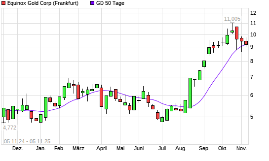 Mit dem Rücksetzer auf 9,00 EUR hat die Equinox Gold-Aktie am 04.11.2025 die 50-Tage-Linie nach unten gekreuzt.Die Equinox Gold-Aktie befindet sich seit dem 12.08.2025 im langfristigen ...weiterlesen