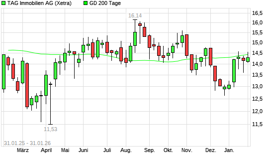 Mit dem Rücksetzer auf 14,06 EUR hat die TAG Immobilien-Aktie am 30.01.2026 die 200-Tage-Linie nach unten gekreuzt.Die TAG Immobilien-Aktie befand sich seit dem 29.01.2026 ...weiterlesen