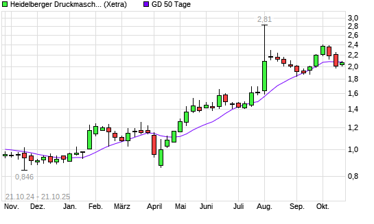 Mit dem Anstieg auf 2,08 EUR hat die Heidelberger Druckmaschinen-Aktie am 20.10.2025 die 50-Tage-Linie nach oben gekreuzt.Die Heidelberger Druckmaschinen-Aktie befindet sich seit dem 14.04.2025 ...weiterlesen