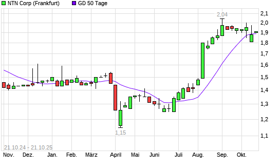 Mit dem Anstieg auf 1,91 EUR hat die NTN Corporation-Aktie am 20.10.2025 die 50-Tage-Linie nach oben gekreuzt.Die NTN Corporation-Aktie befindet sich seit dem 23.07.2025 im langfristigen Aufwärtstrend ...weiterlesen