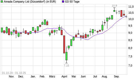Mit dem Anstieg auf 10,30 EUR hat die Amada-Aktie am 30.09.2025 die 50-Tage-Linie nach oben gekreuzt.Die Amada-Aktie befindet sich seit dem 26.06.2025 im langfristigen Aufwärtstrend und hat ...weiterlesen