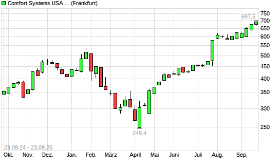 Mit dem Anstieg auf 697,50 EUR hat die Comfort Systems-Aktie (ISIN US1999081045) am 22.09.2025 ein neues All-Time-High erreicht und damit den Kurs vom 18.09.2025 eingestellt.Die Comfort Systems-Aktie ...weiterlesen