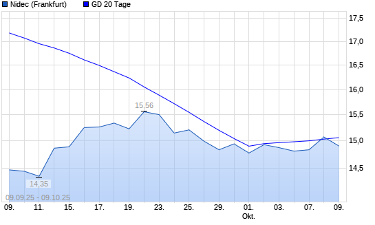 Mit dem Anstieg auf 15,07 EUR hat die Nidec-Aktie am 08.10.2025 die 20-Tage-Linie nach oben gekreuzt.Die Nidec-Aktie befindet sich seit dem 04.09.2025 im langfristigen Abwärtstrend und hat in ...weiterlesen