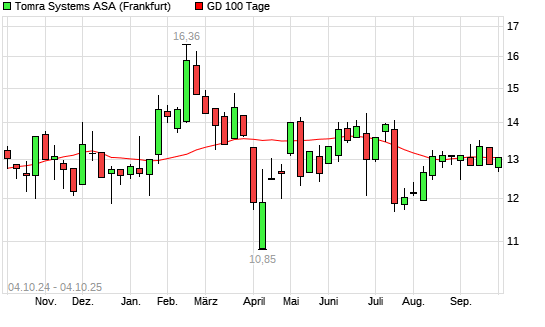 Mit dem Anstieg auf 13,05 EUR hat die Tomra Systems-Aktie am 03.10.2025 die 100-Tage-Linie nach oben gekreuzt.Die Tomra Systems-Aktie befindet sich seit dem 22.09.2025 im langfristigen Abwärtstrend ...weiterlesen