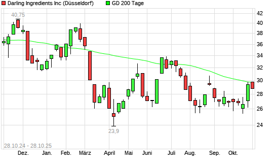 Mit dem Rücksetzer auf 29,42 EUR hat die Darling Ingredients-Aktie am 27.10.2025 die 200-Tage-Linie nach unten gekreuzt.Die Darling Ingredients-Aktie befand sich seit dem 23.10.2025 im ...weiterlesen