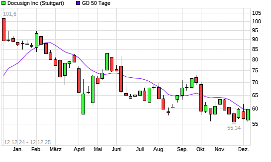 Mit dem Anstieg auf 59,67 EUR hat die Docusign-Aktie am 11.12.2025 die 50-Tage-Linie nach oben gekreuzt.Die Docusign-Aktie befindet sich seit dem 06.06.2025 im langfristigen ...weiterlesen