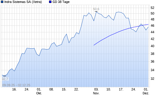 Mit dem Rücksetzer auf 44,62 EUR hat die Indra Sistemas-Aktie am 01.12.2025 die 38-Tage-Linie nach unten gekreuzt.Die Indra Sistemas-Aktie befindet sich seit dem 18.02.2025 im langfristigen ...weiterlesen