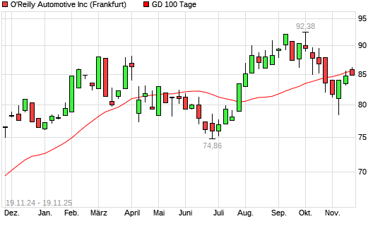 Mit dem Rücksetzer auf 84,92 EUR hat die O'Reilly Automotive-Aktie am 18.11.2025 die 100-Tage-Linie nach unten gekreuzt.Die O'Reilly Automotive-Aktie befindet sich seit dem 07.11.2025 im ...weiterlesen