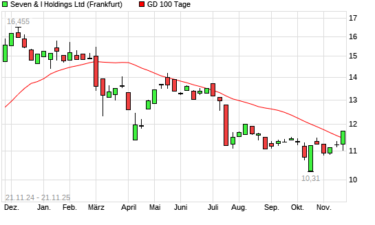Mit dem Anstieg auf 11,67 EUR hat die Seven & Holdings-Aktie am 20.11.2025 die 100-Tage-Linie nach oben gekreuzt.Die Seven & Holdings-Aktie befindet sich seit dem 13.05.2025 im langfristigen ...weiterlesen
