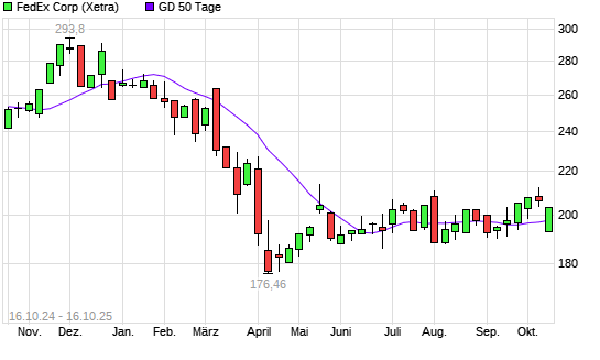 Mit dem Anstieg auf 202,25 EUR hat die FedEx-Aktie am 15.10.2025 die 50-Tage-Linie nach oben gekreuzt.Die FedEx-Aktie befindet sich seit dem 03.02.2025 im langfristigen Abwärtstrend und hat ...weiterlesen