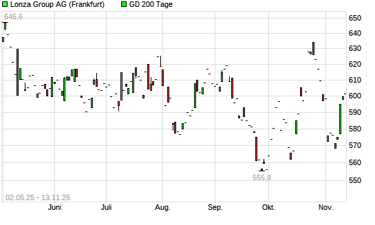 Mit dem Anstieg auf 599,60 EUR hat die Lonza Group-Aktie am 12.11.2025 die 200-Tage-Linie nach oben gekreuzt.Die Lonza Group-Aktie befand sich seit dem 31.10.2025 im langfristigen Aufwärtstrend ...weiterlesen