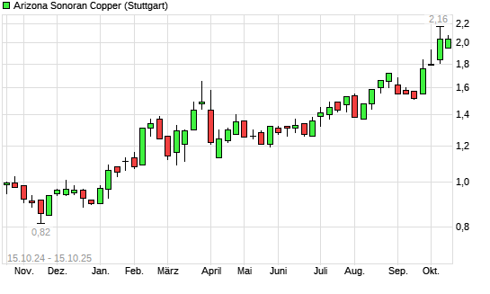 Mit dem Anstieg auf 2,12 EUR hat die ARIZONA SONORAN COPPER-Aktie (ISIN CA04058Q1054) am 14.10.2025 ein neues All-Time-High erreicht und damit den Kurs vom 09.10.2025 eingestellt.Der Abstand ...weiterlesen