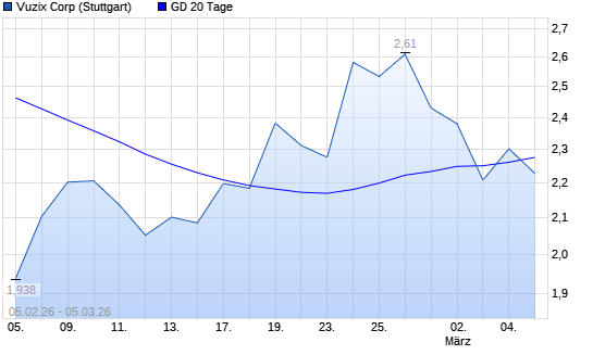 Mit dem Rücksetzer auf 2,20 EUR hat die VUZIX CORP. NEW-Aktie am 04.03.2026 die 20-Tage-Linie nach unten gekreuzt.Die VUZIX CORP. NEW-Aktie befindet sich seit dem 02.03.2026 ...weiterlesen