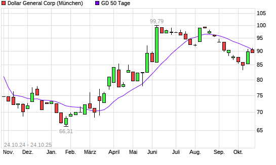 Mit dem Rücksetzer auf 88,94 EUR hat die Dollar General-Aktie am 23.10.2025 die 50-Tage-Linie nach unten gekreuzt.Die Dollar General-Aktie befindet sich seit dem 10.10.2025 im langfristigen ...weiterlesen